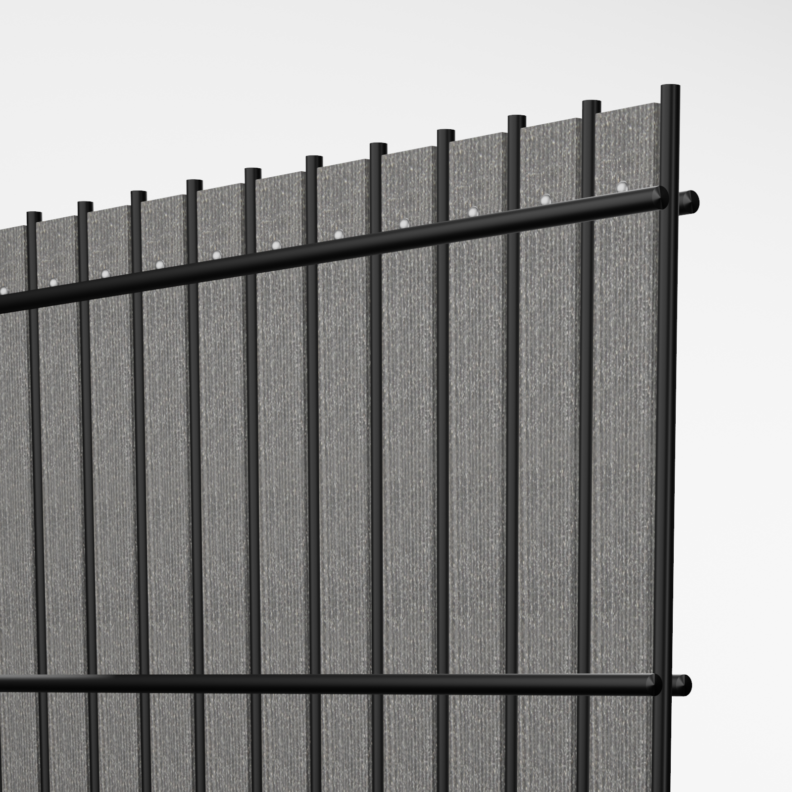 the slats of 3 mm thickness are simply slid vertically through the double wire panels 8/6/8 out of pre-galvanized wire and coated.